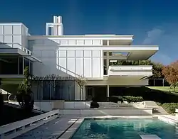 The home is built around a steel frame which is covered by glass and aluminum. The design draws from those of Frank Lloyd Wright and Ludwig Mies van der Rohe. It reflects a minimalist approach and straight lines. There are no curves in the home.[2][5] The house features cantilevered horizontal shapes overlapping each other surrounding a courtyard. Inside there are four floors which have 12 level changes and there are 14 separate ceiling heights.[1] It is said to resemble Frank Lloyd Wright's Fallingwater design.[6] The building's design constructs an illusion of levitating horizontal planes: vertical planes are disguised by the cantilevered planes.[4]