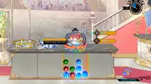 The cooking phase is performed by dropping ingredients into the cookware.[2] With the ingredients in the 4x4 cooking zone, the player can rotate them like in Puyo Puyo.[3] When flavor gems of the same color are aligned, they combine to increase their rank and the quality of the dish.[1] As ingredients are matched and gems rank up, the player's dish increases its quality. Once finished cooking, the player has to deliver the dish to the judge before time runs out.[2]