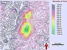 The volcano is composed of alkali feldspar granitic rock of the Robertson River Igneous Suite. This includes felsic complex material such as biotite, hornblende-biotite, magnetite, and alkali granitic rock including rhyolite on the eastern slopes of Battle Mountain[5] and the adjacent (and geologically related) Little Battle Mountain (elevation 937 feet).