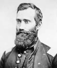 Realizing the vulnerability of the settlers of central Minnesota, the U.S. Volunteer Army preemptively dispatched mustering units from Fort Snelling to reinforce and protect the frontier. Among these was Captain Richard Strout's detachment of the Tenth Minnesota Infantry Regiment. On this journey, Strout's company comprised of 64 men,[2] most of whom originally enlisted for the Civil War or were civilian volunteers seeking to protect their communities. Strout's command marched on orders to patrol the areas around Hutchinson, Acton and Forest City, dated August 24.[3] On September 2 they camped 2½ miles northwest[4] of the home of Robinson Jones, where the murder of Jones and several others by four young Dakota men on August 17, in what was later termed the Acton Incident, had shed the first blood of the conflict.