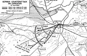 At this critical point, sixty tanks from Combat Command A of the 2nd Armored Division and accompanied by infantry of the 29th Division,[3] counterattacked southwest from Carentan at 4:30 p.m.,[3] inflicting severe casualties on the Germans and forcing them to withdraw with the loss of four tanks.[4] The American victory led to the linkup of forces from Utah and Omaha Beaches, creating a secure lodgement area for further American operations.