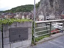 In 1914, the town had a population of 7,000 people and was an important strategic crossing on the Meuse, where the river flows through a south–north gorge. Three roads and a path converged on the town from the east, over an escarpment and down into the town, along which an attack from the east would come. The wooded ridge on the east bank was topped by the Napoleonic era stone Citadel of Dinant overlooking the town and the Meuse bridge, 100 m (330 ft) below.[1] In 1914 there was a ribbon of streets about 4 km (2.5 mi) long on the east bank, a few hundred metres wide.[2] Before the battle, the Mayor of Dinant urged the population to not take part in the fighting and forbade manifestations in support of the Allies.[3]