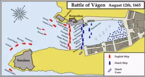 The Battle of Vågen was a naval battle between a Dutch merchant and treasure fleet; and an English flotilla of warships in August 1665 as part of the Second Anglo-Dutch War. The battle took place in Vågen (meaning "the bay, voe" in Norwegian), the main port area of neutral Bergen, Norway. Due to a delay in orders, the Norwegian commanders took the side of the Dutch, contrary to the secret intentions of the King of Norway and Denmark. The battle ended with the retreat of the English fleet, which was much damaged but had lost no ships. The treasure fleet was relieved by the Dutch home fleet 17 days later.