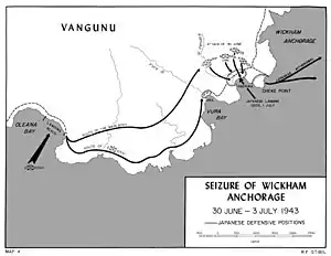 The Battle of Wickham Anchorage took place during the New Georgia campaign in the Solomon Islands during the Pacific War from 30 June – 3 July 1943. During the operation US Marines and US Army troops landed by ship around Oleana Bay on Vangunu Island and advanced overland towards the anchorage where they attacked a garrison of Imperial Japanese Navy and Army troops. The purpose of the attack by the US was to secure the lines of communication and supply between Allied forces involved in the New Georgia campaign and Allied bases in the southern Solomons. The US forces were successful in driving the Japanese garrison from the area and securing the anchorage, which would later be used to stage landing craft for subsequent operations.