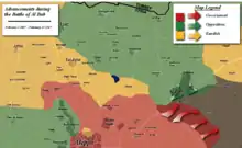 After failing to penetrate al-Bab from the north or west, rebel and Turkish forces started assaults from the east.[129] On 8 January, Turkish-backed rebels captured Um Adasa and Makri Hill near Bizaah.[130] The next day, the rebels once again advanced near Bizaah, capturing Zammar and Asfar Tepe.[131] With these advances, the rebels were attempting to flank al-Bab from the east.[132] Still, in the period between 1 and 14 January, the rebels made eight attempts to capture the nearby village of Al-Suflaniyah, with all of them being repelled.[133][134] At one point, on 13 January, the rebels managed to capture Suflaniyah temporarily,[135] but had to retreat from it after an ISIL counter-attack.
