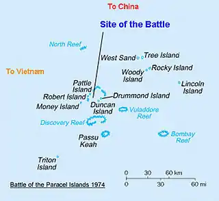 The Battle of the Paracel Islands (Chinese: 西沙海战, Pinyin: Xisha Haizhan;Vietnamese: Hải chiến Hoàng Sa) was a military engagement between the naval forces of China and South Vietnam in the Paracel Islands on January 19, 1974. The battle was an attempt by the South Vietnamese navy to expel the Chinese navy from the vicinity. The confrontation took place towards the end of the Vietnam War.