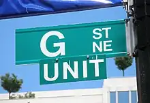 For the first block of a street as counted from the relevant axis (that is, with house numbers from 1 to 99), the city posts the word "unit" on a plaque below the street name sign and labels the first block the unit block. This practice differs from most American cities, which post a plaque bearing a zero or a one followed by an arrow. Subsequent blocks are marked in the conventional fashion as "100", "200", and so forth.