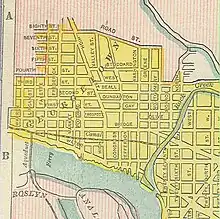 In 1893, Congress passed a law mandating that existing streets must be changed or moved in order to be in conformity with the district's street plan.[21] Some property owners were upset that their private property would need to be seized without compensation in order to move streets in conformance with the street plan.[20] The Supreme Court agreed, striking down the law as unconstitutional.[20] In 1893, Congress mandated a new system of highways within the district that conformed to the City of Washington's street plan but left existing streets in place.[22] A separate act of Congress in 1895 required that the street names in Georgetown be changed to conform to the street naming system used in the City of Washington.[23] However, the old street names were shown on maps as late as 1899.
