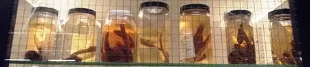 The museum houses a collection of more than two million specimens, some dating back to as early as the 1910s.[12] These specimens are divided into six main subcollections – the Cowan Tetrapod Collection, the Marine Invertebrate Collection, the Herbarium, the Spencer Entomological Collection, the Fish Collection, and the Fossil Collection – and over 500 permanent exhibits.[9] Most items are accompanied by a description card briefly outlining details like the species and provenance information.[10]