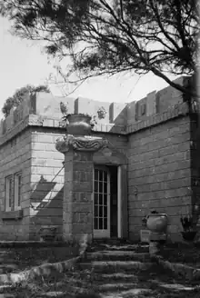 Michael O'Connell (1898–1976), a British soldier returned from the Western Front, between 1924 and 1926 built Barbizon (named after the French art school), on a bush block in Tramway Parade near Beach Road. The house was constructed from hand made concrete blocks on a simple cruciform plan and regarded by some as an early Modernist design.[79] It became a meeting place for Melbourne's alternative artists and designers including members of the Arts and Crafts Society. During the 1920s O'Connell focussed on School of Paris inspired textile design with his wife Ella Moody (1900–1981). Michael and Ella returned to England for a visit in 1937 but with the outbreak of war remained there and never returned to Australia. Barbizon was destroyed by the bushfire of 1944.[80]