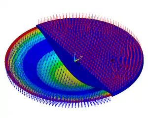 Bending of an edge-clamped circular plate under the action of a transverse pressure. The left half of the plate shows the deformed shape, while the right half shows the undeformed shape. This calculation was performed using Ansys.