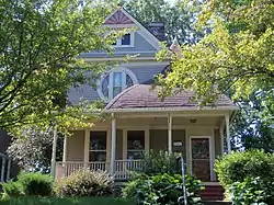 There are a few picturesque touches found on this house that distinguish it from the other houses in the neighborhood.[2] The house is a frame structure that follows an L-plan with a front porch. The fanciful roofscape features a sweeping curve that extends over the porch. A small polygonal turret enhances the picturesque effect. Other noteworthy details include the gable-end shingling, the narrow, denticular belt coursing, and the second-floor window whose framing gives it a circular appearance.