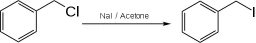 Benzyl iodide can be obtained via the Finkelstein reaction from benzyl chloride and sodium iodide in acetone.