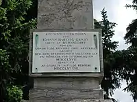 Æreminde efter Døden / for / Johan Hartvig Ernst / Greve af Bernstorff / som gav / udskiftede :::hovningsfrie arvelige /Gaarde / med dem Stræbsomhed Velstand alt / til Mønster for Efterslægten / :::MDCCLXVII / oprettet / af Godsets takfulde Beboere MDCCLXXXIII.