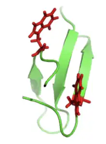 - ↑ Blanco, F. J.; Rivas, G.; Serrano, L. (1994). "A short linear peptide that folds into a native stable beta-hairpin in aqueous solution". Nat Struct Biol. 1 (9): 584–590. doi:10.1038/nsb0994-584. PMID 7634098. S2CID 35065527.