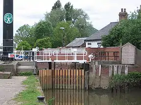 The Beck has been improved by a major dredging programme,[16] which lasted for five months and was completed in April 2004. Sampling of the sediments before work began revealed high levels of heavy metals and hydrocarbons, as a result of historic industrial processes, and they therefore had to be taken to a hazardous landfill site when they were removed from the Beck. Land and Water, the contractors responsible for the project, developed a special screening plant that enabled the hazardous waste to be separated from non-hazardous sediments, and this was the first time that such a system had been used on an inland waterways contract.[17] In mid-2005, a multimillion-pound scheme to redevelop the Beck and its immediate vicinity began. The final stage, which started in February 2007 and cost £250,000, involved restoration of the lock gates and pumping station, together with the construction of footpaths and cycle routes.[18] The previous set of gates were fitted in 1953.[19]