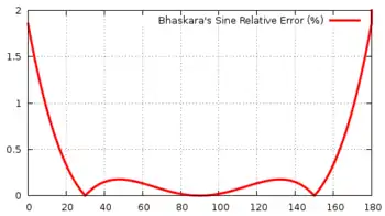 In mathematics, Bhāskara I's sine approximation formula is a rational expression in one variable for the computation of the approximate values of the trigonometric sines discovered by Bhāskara I (c. 600 – c. 680), a seventh-century Indian mathematician.[1] This formula is given in his treatise titled Mahabhaskariya. It is not known how Bhāskara I arrived at his approximation formula. However, several historians of mathematics have put forward different hypotheses as to the method Bhāskara might have used to arrive at his formula. The formula is elegant and simple, and it enables the computation of reasonably accurate values of trigonometric sines without the use of geometry.[2]