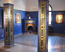 The most notable tiles are in the first floor reception room. Here, the entryway features a columned archway featuring the tiles produced by the Bezalel school featuring the designs of Ze'ev Raban produced as ceramic art tiles. One of the columns has tile cartouches of the twelve months, the other, the twelve tribes of Israel. On the sides are a pair of cartouches, one, the famous "Judea capta" coin issued by the Emperor Titus after the Roman defeat of the Jewish Revolt of the year 70. The well-known coin shows a woman, Judea, sitting under a palm tree in chains, over her stands the Roman Emperor in armor. The artist riffs on this familiar image with a scene featuring Judea liberated, rising as the chains break.[2]