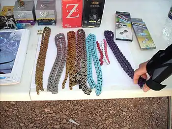 In order to reduce weight, chains have been manufactured with hollow pins and with cut-outs in the links.[21] Chains have also been made of stainless steel for corrosion resistance[22] and titanium for weight reduction, but they are expensive.[23] A recent trend is chains of various colors, and at least one manufacturer offers a chain model specifically for electric bicycles.[24]