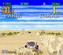 Big Run[lower-alpha 1] is a rally racing arcade video game released by Jaleco in 1989. Rendered in 3D, the game is the first to be set in the Paris-Dakar rally raid which the player drives a Porsche 959, resembling that of the 1986 winner. Opponents in the game resemble Peugeot 205 T16s, which went on to win in the 1987 Paris-Dakar rally, with Mitsubishi Pajeros also appearing occasionally.