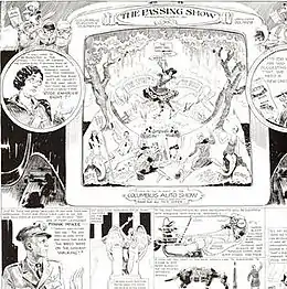 The feature was a much-beloved fixture of the Sunday Dispatch, both for its graphic inventiveness (the mastheads alone are worth the price of admission) and all the local color. Ireland seemingly knew everyone and everything in Columbus, and he lovingly lampooned it all each Sunday. The pages were always jam-packed... filled to the brim with local happenings, oddball news and personal anecdotes... The creator took a vacation every summer, during which substitutes would be called upon to keep the Show rolling, as it were... Billy Ireland was noted for his kindnesses to aspiring cartoonists. He was Dudley Fisher's mentor in the 1910s, and later gave Milton Caniff his first pro cartooning job at the Dispatch. Noel Sickles also acknowledges a great debt to Ireland for giving him early encouragement. After Ireland's death The Passing Show was continued by Harry Keys, who renamed it We Folks in 1938. Others who took a crack at the Ireland legacy page were Bob Vittur and Myron Dixon. As We Folks, the feature ran until at least 1944.[1]