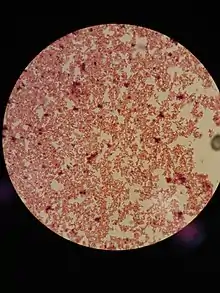B. wadsworthia is a Gram-negative, catalase-positive, and usually urease-positive bacterium.[2] Although most strains are urease positive, there are some strains that are urease negative. This bacterium is approximately 0.7 μm wide by 1.0–10.0 μm long in colony and the cells are pleomorphic with irregular cell walls.[3][4] B. wadsworthia, due to its slow nature to grow in standard media for anaerobes, is often misidentified as other anaerobes or not identified at all.[2] The best identifier for this bacterium is a transparent colony with a black center in BBE agar; the black center is ferrous sulfide, which is created by the hydrogen sulfide the bacteria produces.[2][4] Another unique characteristic of B. wadsworthia is its positive catalase reaction with a 15% hydrogen peroxide reagent; its catalase reaction is unlike other catalase-positive species because the reaction is explosive with bubble formation and is very quick.[5] The most accurate method to identify this bacterium from other similar species is through gas liquid chromatography (GLC); GLC results show that there are a lot of acetic acid peaks and minimal succinic acid present. B. wadsworthia is non-motile and is non-spore forming.[3] In addition, this bacterium has irregular cell walls and no flagella attached to it. The two factors that stimulate its growth are bile and pyruvate; specifically, 20% bile and 1% pyruvate.[4]