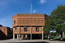 His final substantial work was the library block at Ipswich School (1980–82), now listed at grade II. The octagonal library building is raised on concrete supports with a jettied upper storey and is decorated with diamonds and bands in blue brick. It has circular windows and stained glass by John Piper.[3][4]