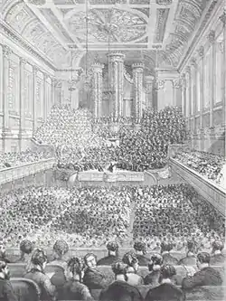 Originally hosted in St Philip's Church (later to become the city's cathedral) or the Theatre Royal on New Street the available venues became too small for the festival. As a result, the Birmingham Town Hall was built,[1] and opened in 1834 to house it. The festival for 1832 was delayed by two years during its erection.