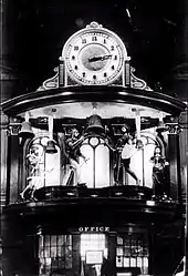 In 1936 a clock, formerly in the Imperial Arcade at Dale End, was restored - at the behest of Percy Shurmer - and installed. Crafted by William Potts and Sons of Leeds in 1883, and restored by them, it consisted of over-life-size figures of Guy of Warwick, the Countess, a retainer and a Saracen, and had bells (recast in 1935 by John Taylor & Co of Loughborough) that struck the hours and Westminster Quarters.[16]
