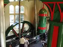 When the lake first opened there were four Woolf compound rotative beam pumping engines, housed in two separate buildings. They were built by Glenfield & Kennedy of Kilmarnock between 1900 and 1905. The engine's beam is 34 ft (10.36 m) long and weighs 17 tons. The flywheel is 20 ft (6.10 m) in diameter and weighs 20 tons,[4] having a crank throw of 3.5 ft (1.07 m). Each beam engine had an output of 170 horsepower (130 kW) at 17 rpm. The high-pressure cylinders, 21 inches (53.3 cm) in diameter and with a 3.25 ft (0.99 m) stroke, were supplied by steam from horizontal Lancashire-type twin flue boilers with Green's economisers at 100 pounds per square inch (6.9 bar). The low-pressure cylinder was 34 inches (86.4 cm) in diameter and has a 7 ft (2.13 m) stroke. Three engines with a fourth on standby could pump water at a rate of 7.5 million imperial gallons (34,000 m3) per day, whilst the boilers consumed 8.5 tons of coal per day. A mechanical efficiency of 90% was claimed, the 30-inch (76.2 cm) diameter pump bucket, 3.5 ft (1.07 m) strike and plunger diameter of 21 inches (53.3 cm) gave a pump output of 107 imperial gallons (490 L) per stroke. They ran until 1949, when two engines from the north engine house were replaced by electric pumps.[12] In 1950 automatic shutdown equipment was installed to prevent damage in the event of a burst main or overloading of the new electric pumps. This meant that it was no longer essential to have staff on site 24 hours a day.[13] The decorative chimney was shortened in the 1960s.[2] In 2014 new split-case vertical pumps and various other new equipment was installed to replace those installed in the 1940s and 1950s.[14]