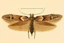 The wingspan is about 16 mm. The forewings have an ash-grey ground colour with reddish-brown markings. The hindwings are dark brown-grey.[2]