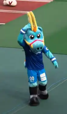 The official team mascot is a 8-year-old Ryūjin, named Blaugon and wears #00.[30]