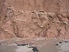 The Blomidon Formation is a unit of Upper Triassic (NorianRhaetian) sedimentary rocks, which outcrops in Nova Scotia. At outcrop they reach a maximum thickness of 365 metres (1,198 ft), but up to 1,168 metres (3,832 ft) has been proven from well data and a thickness of up to 2,500 metres (8,200 ft) has been inferred from seismic reflection data. It overlies the mainly Carnian Wolfville Formation and underlies the North Mountain Basalt.[1] The type section is exposed between Cape Blomidon (45°17′43″N 64°19′55″W / 45.29528°N 64.33194°W / 45.29528; -64.33194) and Paddy Island (45°11′51″N 64°21′34″W / 45.197372°N 64.359411°W / 45.197372; -64.359411).[2]