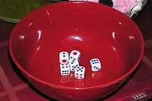 The game requires six dice and a wide mouthed bowl. The first player is assigned and rolls the dice and wins a specific prize depending on the dice combination. The dice are then passed to the next person, and the process is repeated until there are no prizes left.[3] A throw is declared invalid if at least one of the dice lands outside the bowl.[2]