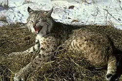 The bobcat prey base overlaps with that of other midsized predators of a similar ecological niche. Research in Maine has shown little evidence of competitive relationships between the bobcat and coyote or red fox; separation distances and territory overlap appeared random among simultaneously monitored animals.[65] However, other studies have found bobcat populations may decrease in areas with high coyote populations, with the more social inclination of the canid giving them a possible competitive advantage.[66] With the Canada lynx, however, the interspecific relationship affects distribution patterns; competitive exclusion by the bobcat is likely to have prevented any further southward expansion of the range of its felid relative.[17]
