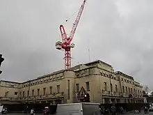 The New Bodleian was designed by architect Sir Giles Gilbert Scott. Construction was completed in 1940. The building was of an innovative ziggurat design, with 60% of the bookstack below ground level.[36][37] A tunnel under Broad Street connects the Old and New Bodleian buildings, and contains a pedestrian walkway, a mechanical book conveyor and a pneumatic Lamson tube system which was used for book orders until an electronic automated stack request system was introduced in 2002.[38] The Lamson tube system continued to be used by readers requesting manuscripts to be delivered to Duke Humfrey's Library until it was turned off in July 2009. In 2010, it was announced that the conveyor, which had been transporting books under Broad Street since the 1940s, would be shut down and dismantled on 20 August 2010.[39][34] The New Bodleian closed on 29 July 2011 prior to rebuilding.[40]