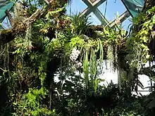 The tropical conservatory was designed in 1964 by Denver architects Victor Hornbein and Ed White Jr. and opened in 1966. Its structure consists of high, interlaced concrete arches inset with faceted Plexiglas panels,[1] which suitably honor benefactor Claude Boettcher of the Ideal Cement Company.[2] In 1973, it was awarded Denver Landmark status. The Boettcher Memorial Tropical Conservatory incorporates more than 11,000 sq. ft. of plants[3] from tropical and subtropical regions,[4] as well as a fabricated two-story banyan tree that offers a multi-layered view of the tropical forest.