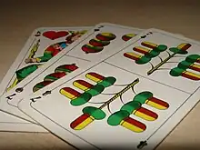 Any number from two to four may play.[lower-alpha 1] The sixes are removed from a standard 36-card Bavarian pattern pack to leave 32 cards in play. The suits are: Acorns, Leaves or Grass, Hearts and Bells.[5]