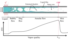 The use of the term critical heat flux (CHF) is inconsistent among authors.[3] The United States Nuclear Regulatory Commission has suggested using the term “critical boiling transition” (CBT) to indicate the phenomenon associated with a significant reduction in two-phase heat transfer.[4] For a single species, the liquid phase generally has considerably better heat transfer properties than the vapor phase, namely thermal conductivity. So in general CBT is the result of some degree of liquid deficiency to a local position along a heated surface. The two mechanisms that result in reaching CBT are: departure from nucleate boiling (DNB) and liquid film dryout.