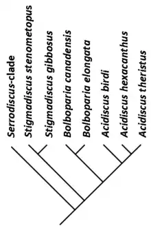 Bolboparia is most closely related to Acidiscus and slightly more distantly to Stigmadiscus.