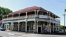 In April 1905, John Carl Streiner opened his Commercial Hotel on the north-west corner of High Street and Park Street. It was a two-storey building with filigree lace balustrading on the upper verandah. Streiner had formerly operated the Royal Exchange Hotel (previously known as the Dugandan Hotel, not to be confused with the current hotel of that name in Dugandan). Carl Behncken leased and operated the new hotel.[46][47]