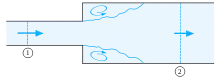 The Borda–Carnot equation is applied to the flow through a sudden expansion of a horizontal pipe. At cross section 1, the mean flow velocity is equal to v1, the pressure is p1 and the cross-sectional area is A1. The corresponding flow quantities at cross section 2 – well behind the expansion (and regions of separated flow) – are v2, p2 and A2, respectively. At the expansion, the flow separates and there are turbulent recirculating flow zones with mechanical energy losses. The loss coefficient ξ for this sudden expansion is approximately equal to one: ξ ≈ 1.0. Due to mass conservation, assuming a constant fluid density ρ, the volumetric flow rate through both cross sections 1 and 2 has to be equal: