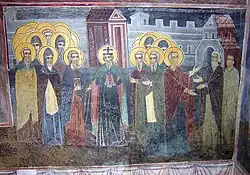 After his baptism, the first major task that Boris undertook was the baptism of his subjects and for this task he appealed to Byzantine priests between 864 and 866.[37] At the same time Boris sought further instruction on how to lead a Christian lifestyle and society and how to set up an autocephalous church from the Byzantine Patriarch Photios. Photios' answer proved less than satisfactory, and Boris sought to gain a more favorable settlement from the Papacy.[38] Boris dispatched emissaries led by the kavhan Peter with a long list of questions to Pope Nicholas I at Rome in August 866, and obtained 106 detailed answers, detailing the essence of religion, law, politics, customs and personal faith. Stemming from his concerns with the baptism of the Bulgarians, Boris also complained to Nicholas about the abuses perpetrated by the Byzantine priests responsible for baptizing the Bulgarians and how he could go about correcting the consequences resulting from these abuses. The pope temporarily glossed over the controversial question of the autocephalous status desired by Boris for his church and sent a large group of missionaries to continue the conversion of Bulgaria in accordance with the western rite.[39][40] Bulgaria's shift towards the Papacy infuriated Patriarch Photios, who wrote an encyclical to the eastern clergy in 867 in which he denounced the practices associated with the western rite and Rome's ecclesiastical intervention in Bulgaria.[40] This occasioned the Photian Schism, which was a major step in the rift between the eastern and western churches.