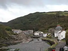 Boscastle (Standard Written Form: Kastel Boterel)[1] is a village and fishing port on the north coast of Cornwall, England, in the civil parish of Forrabury and Minster (where the 2011 Census population was included) . It is 14 miles (23 km) south of Bude and 5 miles (8 km) northeast of Tintagel.[2] The harbour is a natural inlet protected by two stone harbour walls built in 1584 by Sir Richard Grenville and is the only significant harbour for 20 miles (32 km) along the coast. The village extends up the valleys of the River Valency and River Jordan. Heavy rainfall on 16 August 2004 caused extensive damage to the village.
