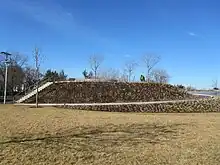 In November 2011, Library Park was renamed Raymond V. Mellone Park, in honor of Mellone, a Brighton native, Korean War veteran and who served on the Boston Rent Control Board and with the Transportation Department, among other agencies.[7] The finished park includes a quarter-mile of pathways, as well as half an acre of open space, a winding path to the east of the park and a coiled, low-incline ramp up a hilltop to the west. One hundred and fifty trees and other foliage around the park’s border surround an open lawn in the center, along with a misting fountain built with three granite lion heads, salvaged from a Western Ave. business.[7] Some areas are meant to encourage residents to use the park for gatherings or educational purposes. The park’s eastern area features an open-air "classroom" for public and library programming and has space for 50 people. A 14-foot (4.3 m) hill was constructed near the rear of the library itself. Patrons can visit a flat meeting area at the top by climbing one of two staircases or by walking around coiled pathway to the top.[8]