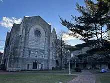 Marsh Chapel, located at the BU beach, is right next to the BU Law Auditorium.