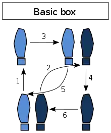 Box step is a basic dance step named after the pattern it creates on the floor, which is that of a square or box. It is used in a number of American Style ballroom dances: rumba,[1] waltz,[2] bronze-level foxtrot. While it can be performed individually, it is usually done with a partner. This is the most common dance step in the waltz. In international standard dance competition, there is a similar step called closed change.[3]