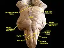 The appearance of a cadaveric brainstem from the front, with major parts labelled