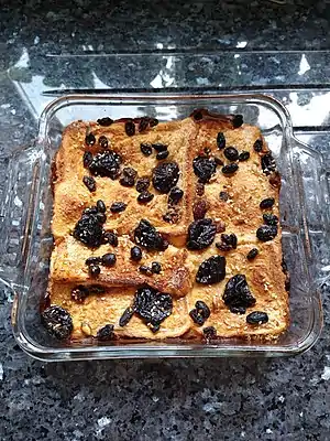 Bread and butter pudding is a traditional bread pudding in British cuisine. Slices of buttered bread scattered with raisins are layered in an oven dish, covered with an egg custard mixture seasoned with nutmeg, vanilla, or other spices, then baked.[1]