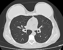 Computed tomography of a woman with breast implants